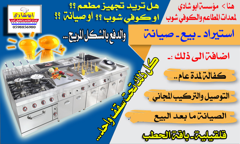 كل ما يلزم المطاعم والكوفي شوب من معدات ..((معدات صح))مكفولة . + . مركز صيانة حديث والتوصل والتركيب ما تقلق فيه ... والدفع بالطريقة المريحة والمناسبة لك .. متوفرة لدى (( مؤسسة ابو شادي لمعدات المطاعم والكوفي شوب )) للطلب والاستفسار من خلال :- جوال 0598856980 .. هاتف :- 092997007 .. موقعنا الالكتروني :- www.aboshadi.com . العنوان :- (( قلقيلية - باقة الحطب )) متواجدين يومياً من الثامنة صباحاً وحتى الرابعة مساءاً عدا الجمعة .. ..