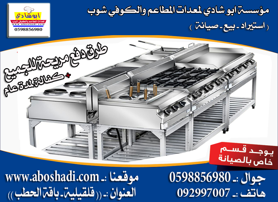 كل ما يلزم المطاعم والكوفي شوب من معدات ..((معدات صح))مكفولة . + . مركز صيانة حديث والتوصل والتركيب ما تقلق فيه ... والدفع بالطريقة المريحة والمناسبة لك .. متوفرة لدى (( مؤسسة ابو شادي لمعدات المطاعم والكوفي شوب )) للطلب والاستفسار من خلال :- جوال 0598856980 .. هاتف :- 092997007 .. موقعنا الالكتروني :- www.aboshadi.com . العنوان :- (( قلقيلية - باقة الحطب )) متواجدين يومياً من الثامنة صباحاً وحتى الرابعة مساءاً عدا الجمعة .. .. ..