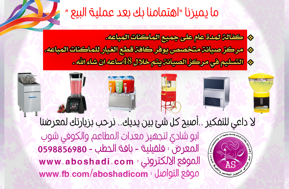 نقدم لكم : ماكنات براد (سلاش) - ماكنات الاسبرسو _ خلاطات كوكتيل - ثلاجات التبريد - ثلاجات التجميد - ثلاجات العرض - الات غسل الصحون الجلايات - افران التيربو - افران البيتزا - ميكرويف - قطاعات- مفارم - عجانات - ميكسرات - طباخ كهربائي - ماكنات النقانق - ماكنات العصير - ماكنات شوكلاته وسحلب - ماكنات الثلج - ماكنات التوستر - ماكنات البوظة - ماكنات البوشار وشعر البنات - الجريل الحجري- جريل البلاطه - مقالي البطاطا كل ذلك مكفول لدى مركز الصيانة المتطور لدينا - جميع قطع الغيار متوفره - طرق دفع مناسبه ما عليكم الا الاتصال على رقمنا 0598856980 أو الاستفسار من خلال صفحتنا على الفيس بوك www.facebook.com/aboshadicom او موقعنا الالكتروني www.aboshadi.com ..
